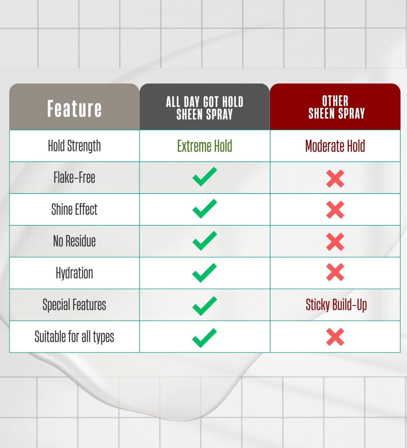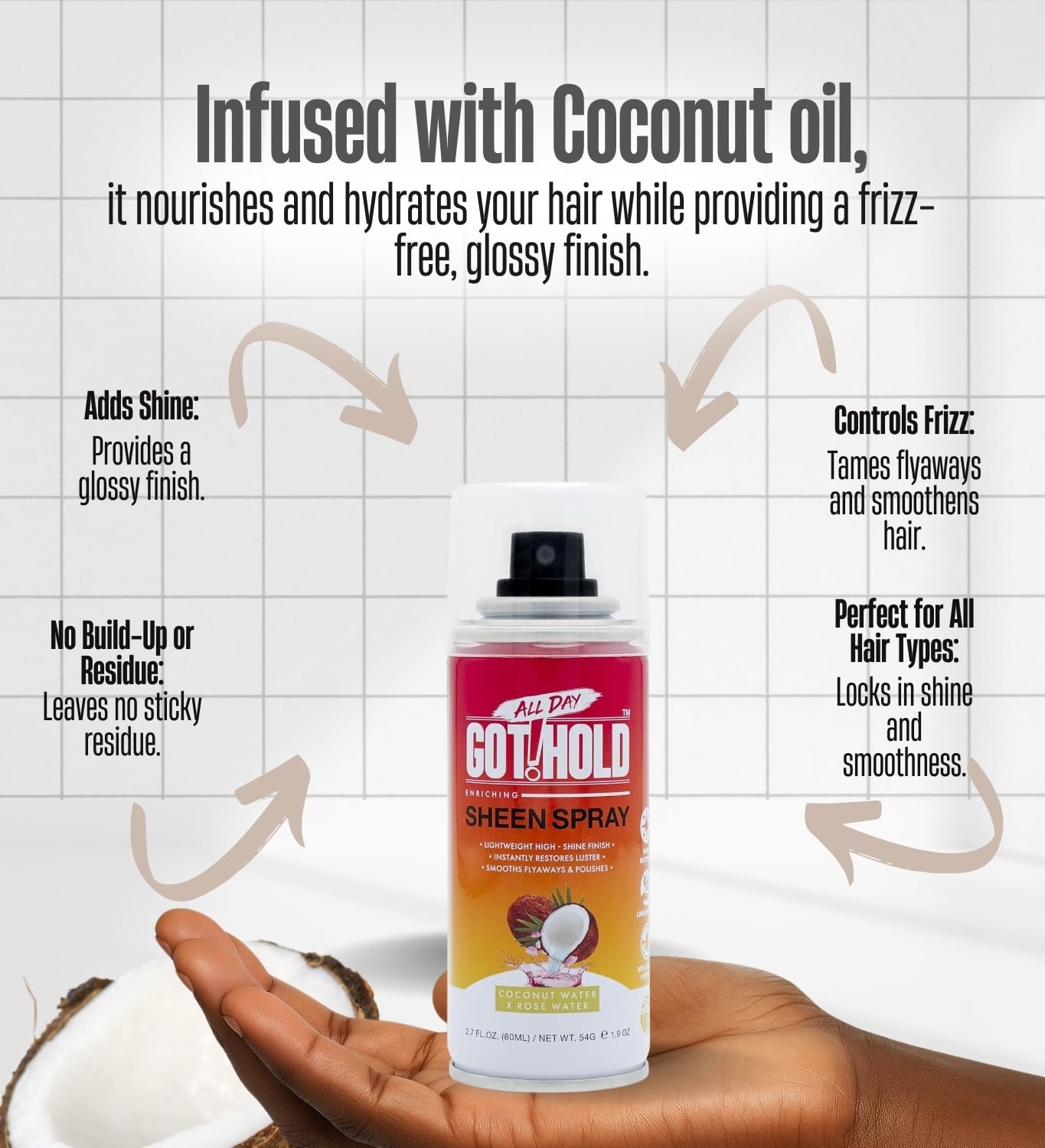 All Day Got Hold Hair Styling Sheen Spray delivers lightweight shine and hydration to all hair types. This 2.7 fl oz spray smooths frizz and flyaways without leaving residue, keeping your hair soft, manageable, and polished all day. Perfect for curls, straight styles, braids, locs, and twist-outs, it refreshes your look with a radiant, healthy glow while maintaining your hair’s natural texture. Enjoy sleek, controlled styles without greasy buildup or heaviness.