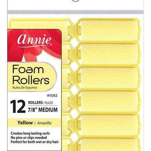Get beautiful curls with Annie Foam Roller Yellow ⅞" Medium. These rollers will create soft, bouncy curls without any of the damage from heat styling tools. They do not require any pins or clips. In every package are 12 medium-sized rollers that will curl your dry or wet hair. They will stay securely in place while providing comfort during use, even if you sleep on them. Expect long-lasting curls after using these rollers on your hair! -- Features: