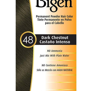 Beautiful dark chestnut hair can be yours with Bigen Permanent Powder Hair Color 48 Dark Chestnut. This permanent powder hair color is effortless to use; all you need is water to mix and start applying. It will create a long-lasting vibrant color that will cover grays. The kit includes color powder, gloves, tray, and instructions, so you will have everything you need for the best results. --