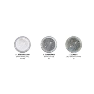 Sugars – The Sugars are also a .008 x .008 grain size. However, the sugars are not solid colors. This type of glitter is a translucent, iridescent plastic grain which offers a hint of color. The Sugars are very difficult to use as liners and are actually intended to transform the eyelid or desired area of skin into a glitter. The Sugars are also incredible for stage performers, but look beautiful and are fun to wear as an everyday eye shadow.