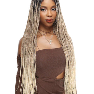 The Tru Wig LHD-5606 features a 13x5 HD transparent lace front with knottless boho box braids for a natural and seamless look. Made with premium fibers and natural baby hairs, this 36" braided wig offers a glueless design with an adjustable band, ensuring comfortable and secure wear. Ideal for anyone wanting a stylish protective style without hassle.