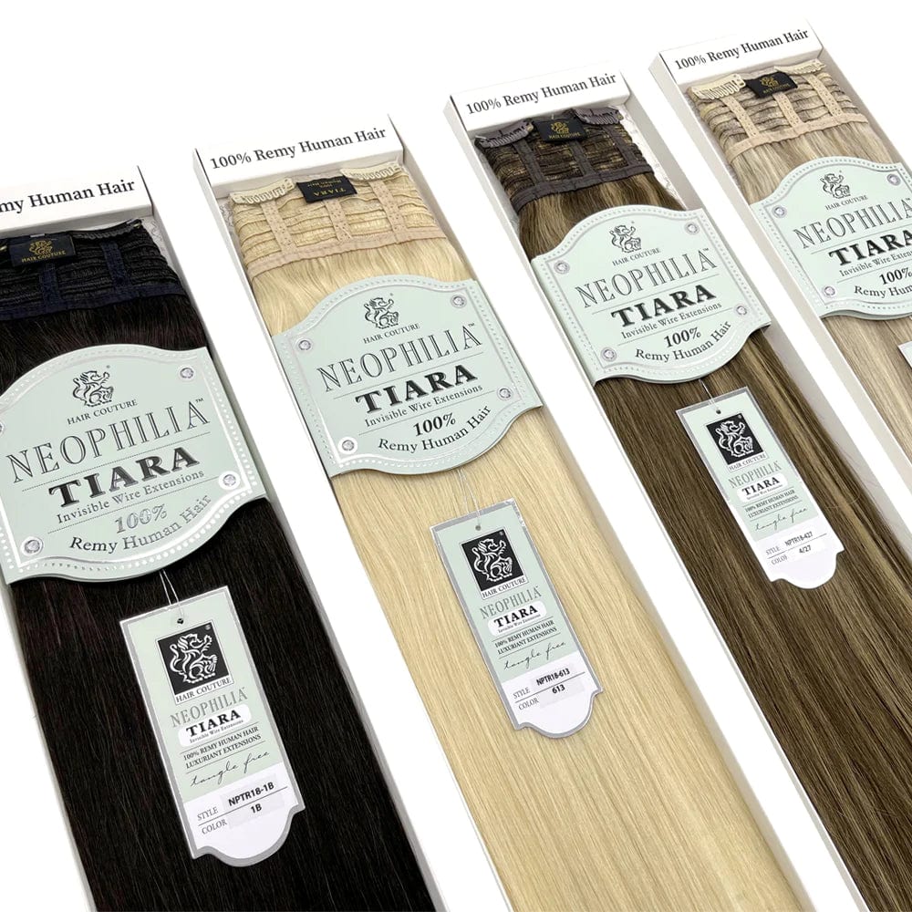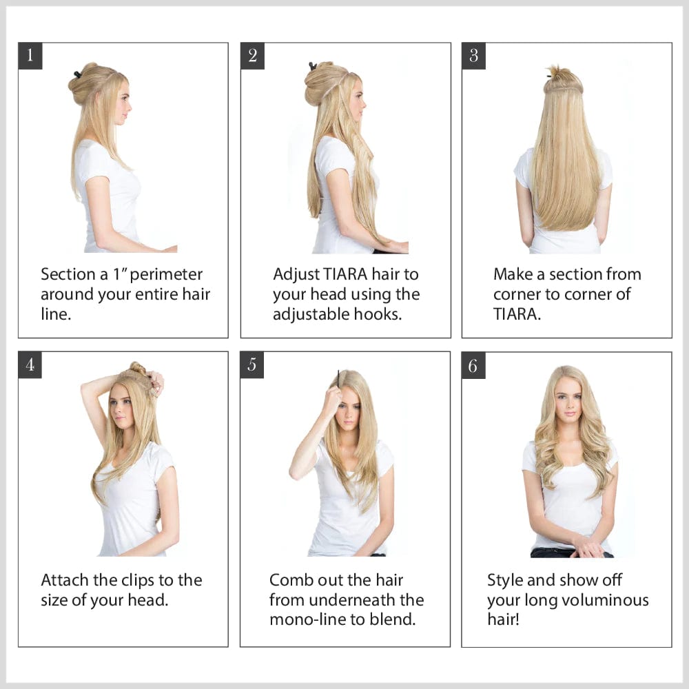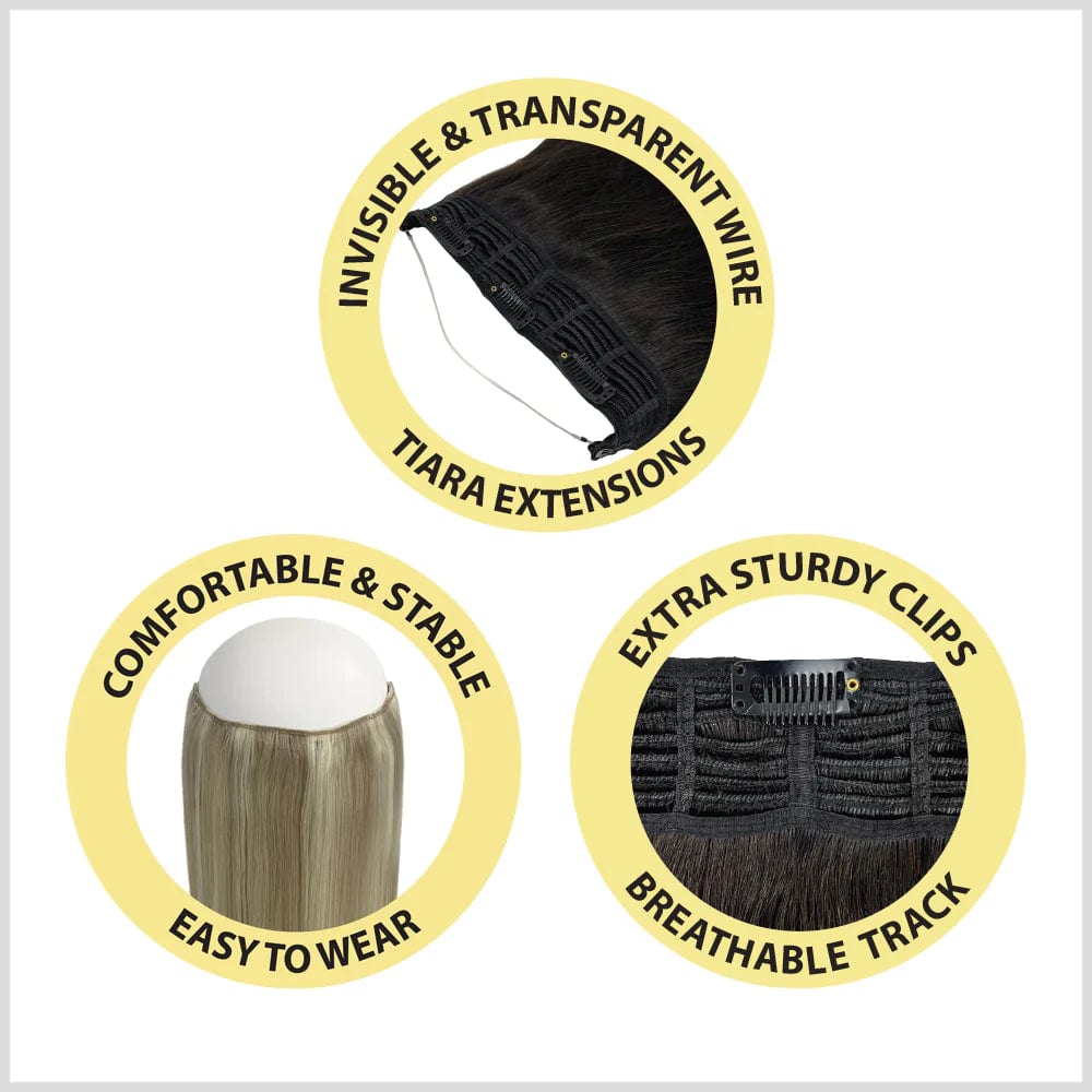 Hair Couture's Invisible Wire Hair Extension with elastic transparent wire. Tiara can blend in seamlessly with your hair color, unlike traditional extensions that require glue or tape. 5 sturdy clips provide comfortable and stable hold and feel. Made with 100% remy human hair, you can style to any occasions.