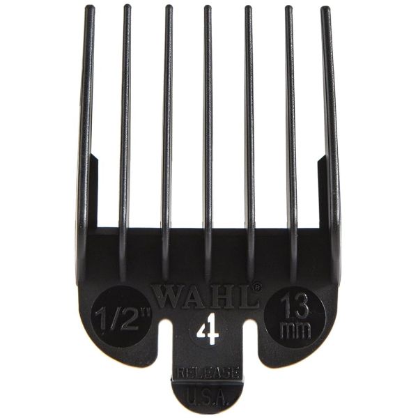 The Wahl #4 Clipper Guide in black delivers a precise 1/2" cutting length for professional grooming results. Compatible with all full-size Wahl Professional blades (except Competition Series and 5-in-1 Magic Blades), this guide attachment ensures consistent, even cuts every time. Essential for barbers and stylists who demand reliability and accuracy in their cutting tools.