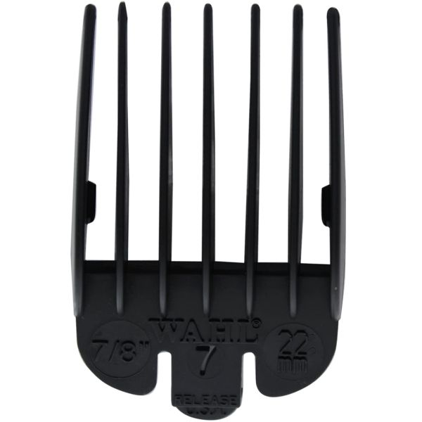 Wahl Professional Cutting Guide #7 in black delivers a precise 7/8" cutting length for consistent, professional results. Compatible with all full-size Wahl Professional blades (excluding Competition Series and 5-in-1 Magic Blades), this guide attachment is an essential tool for barbers and stylists who demand accuracy and reliability. Model 3145-001.